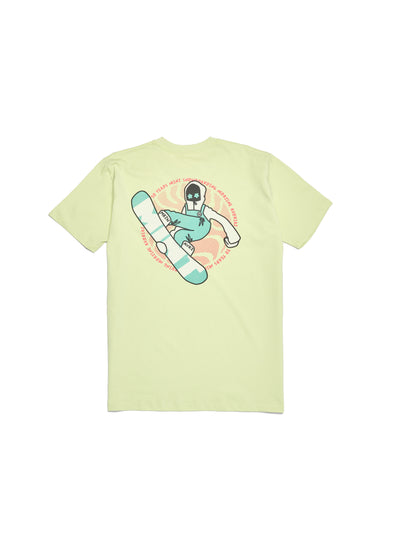 To celebrate 20 years of our friends at MINT Snowboarding we have a capsule collection on limited edition t-shirts available on The Reason web store. This adults yellow coloured t-shirt features artwork by local Morzine rider & artist Alex Crotty.