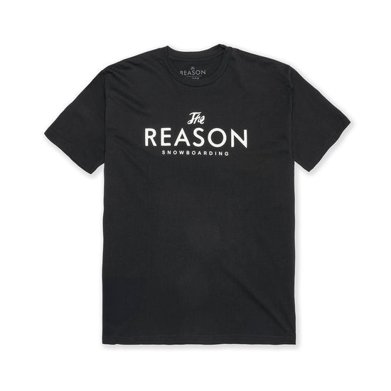 Black t-shirt with 'The Reason Snowboarding' text on a white background